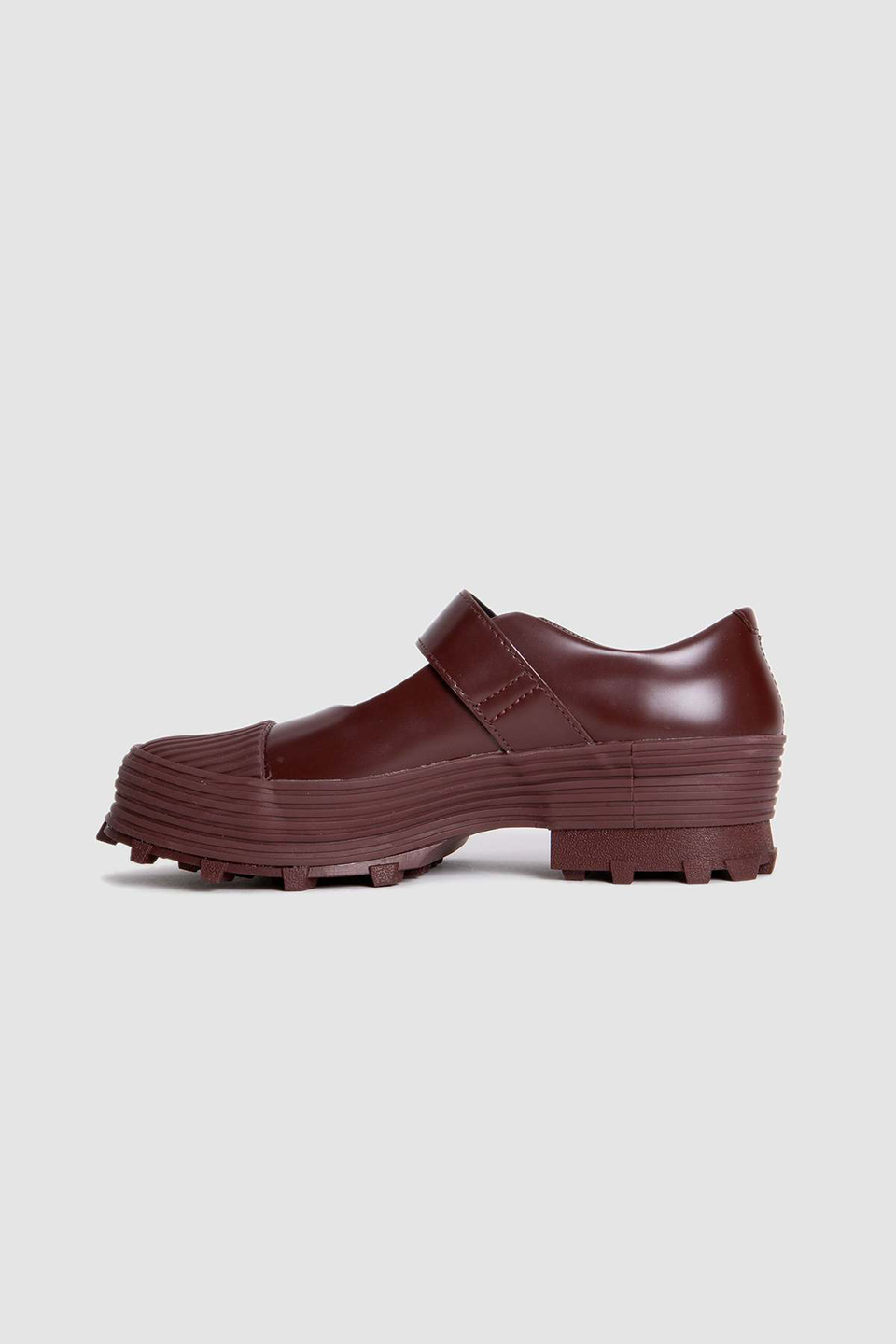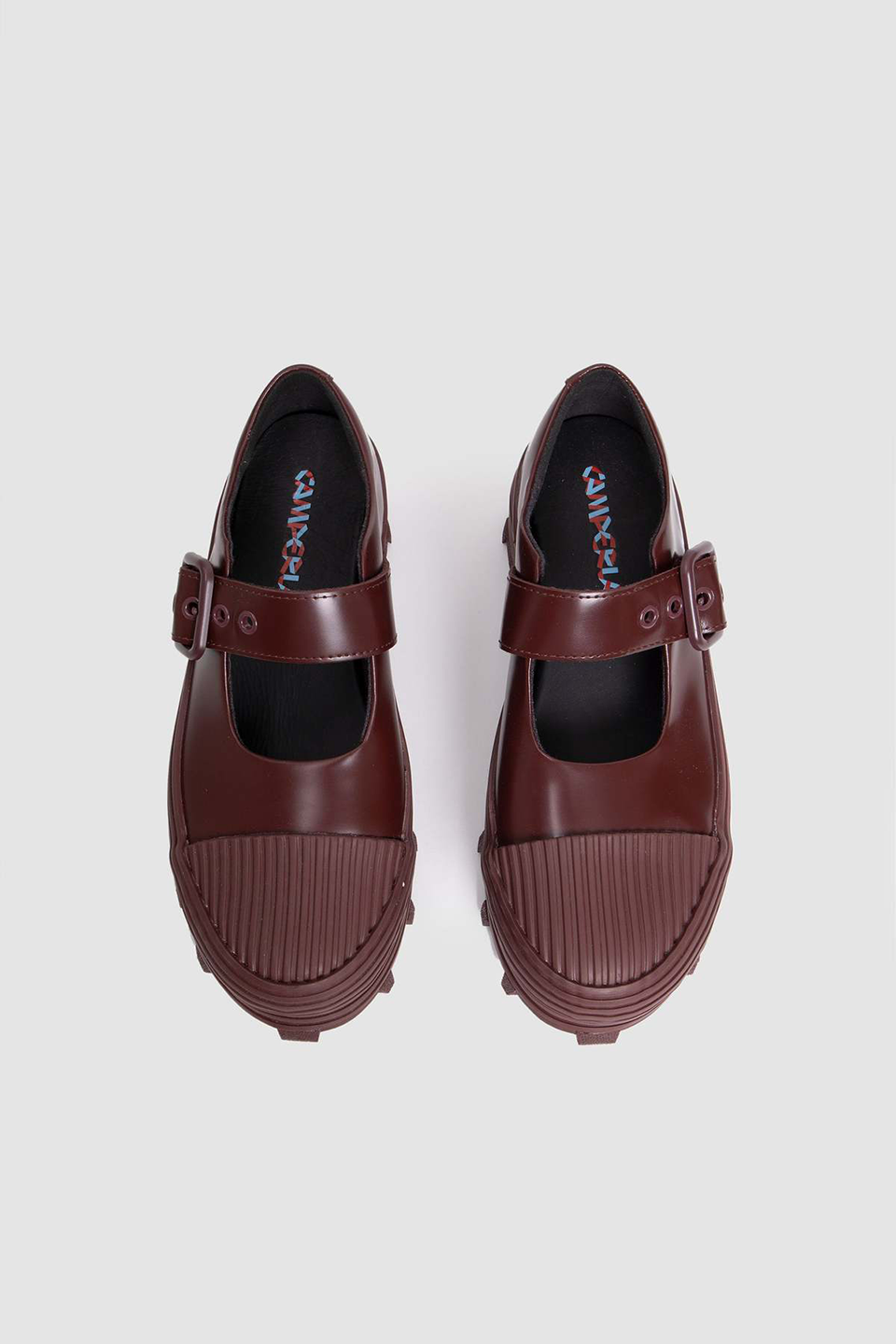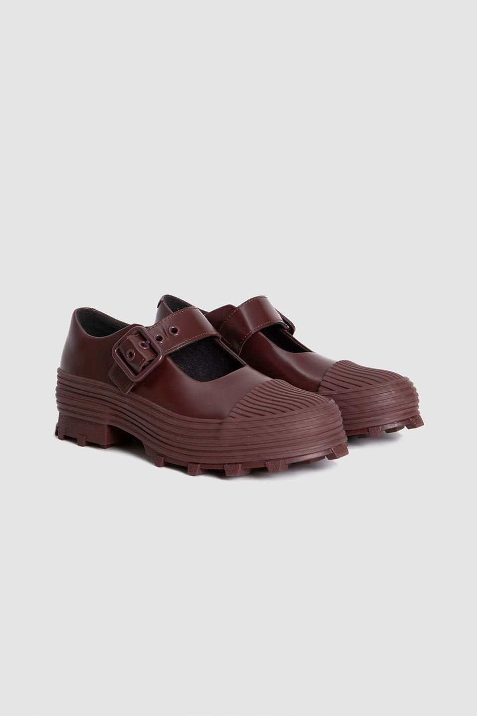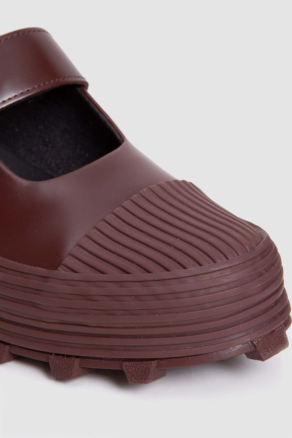 Traktori by Camper is a contemporary clog made of vulcanized leather with an adjustable back strap. It features an OrthoLite Recycled insole for comfort and a serrated rubber outsole for enhanced grip and durability. The lining combines leather and recycled materials, reinforcing the design's sustainability.