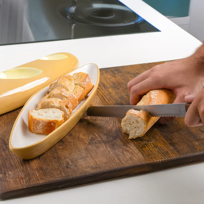 Add a unique touch to your meals with this appetizer plate shaped like a loaf of bread! Place slices of bread or your favorite breadsticks on the bottom, and fill the three compartments with your favorite aioli, olives, or cheese on top... and enjoy! With its modern design and size of 35.5 cm x 8 cm, this unique appetizer bowl will become the center of attention at any dinner or party with friends. And when the party is over, simply put it in the dishwasher and it's ready for the next occasion.