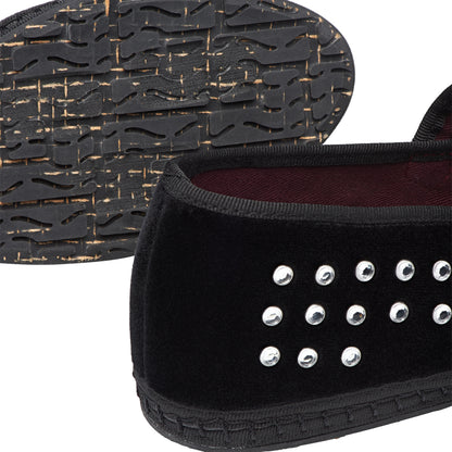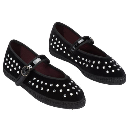 V-neck velvet ballerina flat in black with black trim and crystal studs. Lace up with a patent leather strap and buckle closure. The outside of the shoe is 100% cotton velvet and the inside of the shoe is 100% organic cotton with antibacterial treatment. The sole is made of rubber produced from recycled bicycle tires.