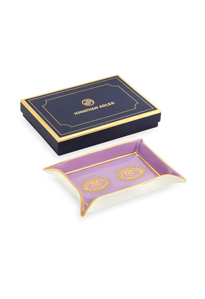 1Chic Tray. Eye-catching eyes in genuine gold pop against an elegant porcelain plate. In alluring amethyst, the Eyes Tray reinvents the classic organizer tray. It's perfect for holding keys on your console, and looks great on your nightstand or dresser. It comes in an elegant gift box making it the perfect gift for yourself or someone else.