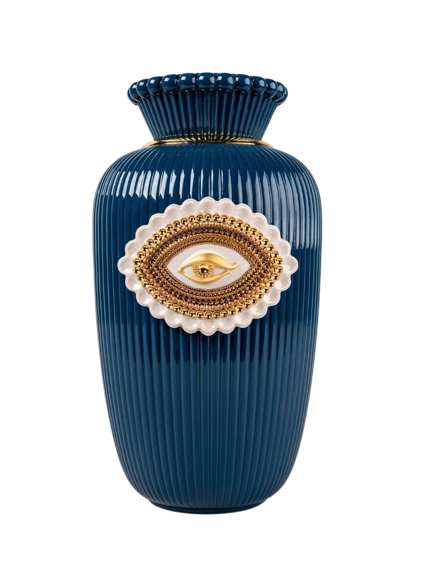 In 1785, when Maria Anne Fitzherbert opened a love letter from her admirer, Prince George of Wales, she did not expect to find an eye staring back at her. They had fallen in love, but their courtship had been disastrous. Royal laws forbade a Catholic widow to become a monarch. The prince was determined to marry her, however, and sent her a letter containing a rare and fascinating gift—a miniature depicting only George’s own right eye. Thus miniature eyes, also known as lover’s eyes, appeared all over Britain for nearly half a century. As with the royal couple, most were commissioned as gifts expressing devotion between loved ones. All were intimate and extremely precious, always meant to be kept in pockets or pinned close to the heart. This fascinating tradition is what inspired the Lovers Eyes collection, and has brought it into the 21st century in functional objects that seem to be looking at us attentively. In this case, a vase featuring an eye engraved in detail on the porcelain. For its decoration, a combination of intense Saxony blue and golden lustre on white porcelain was chosen. A creation full of meaning, functional and hypnotic.