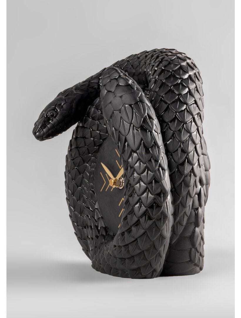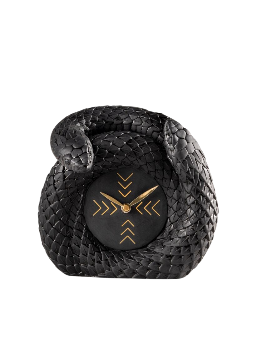 Table clock made of matte black porcelain from the Snakes collection. The snake is a fascinating creature that has always aroused the imagination, fear and curiosity of humans. According to different cultures, it is an ancestral symbol of the cycle of life, of wisdom and knowledge, of spirituality or of power and protection. In this clock, the union between the bodies of two snakes, elaborately crafted, is the perfect place to frame the dial.
