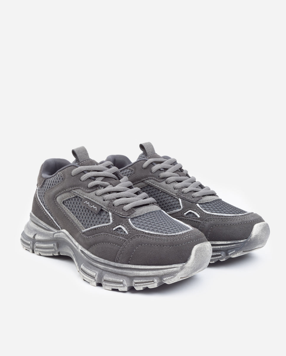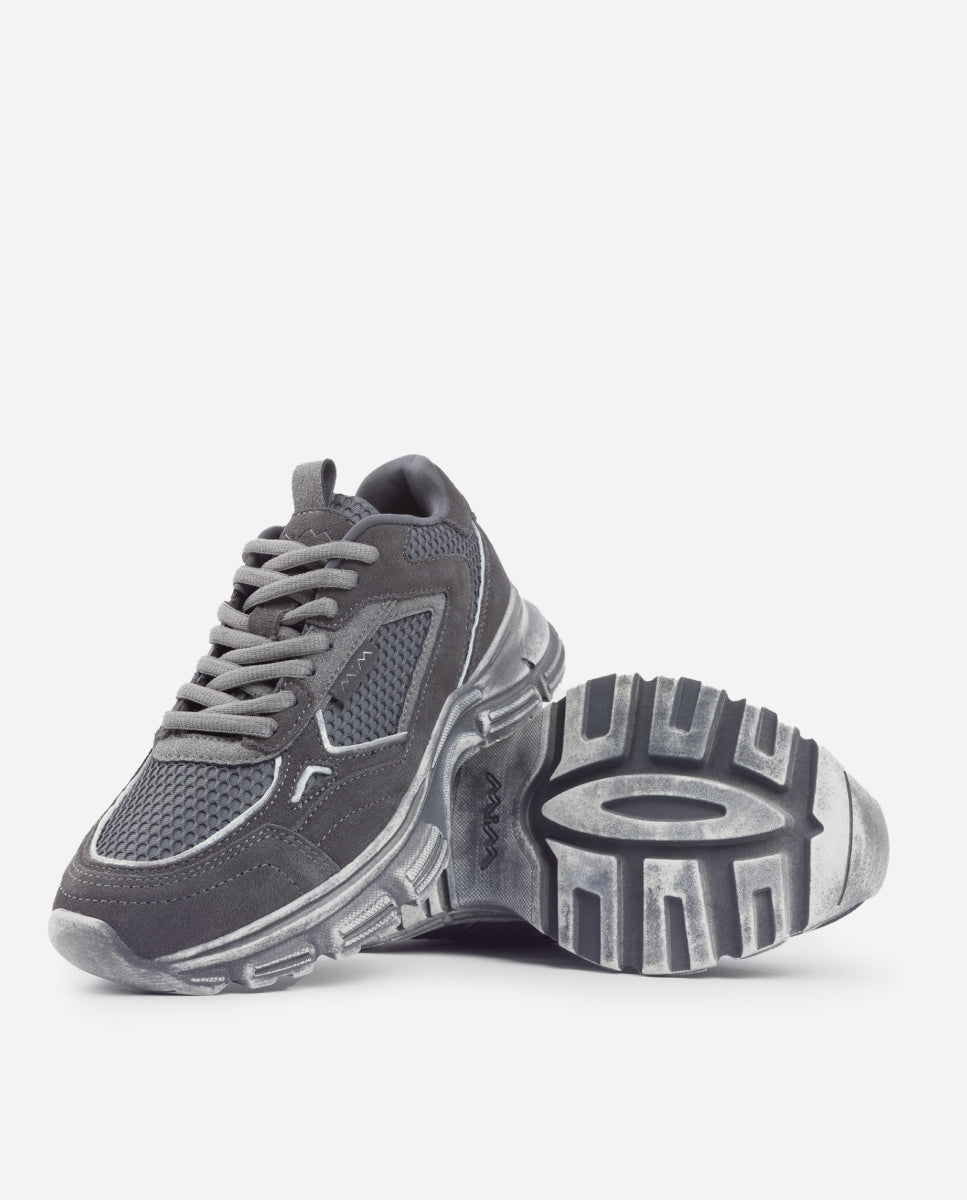 Sports-style sneaker made of anthracite grey leather. Worn-effect sole. Lace-up fastening.