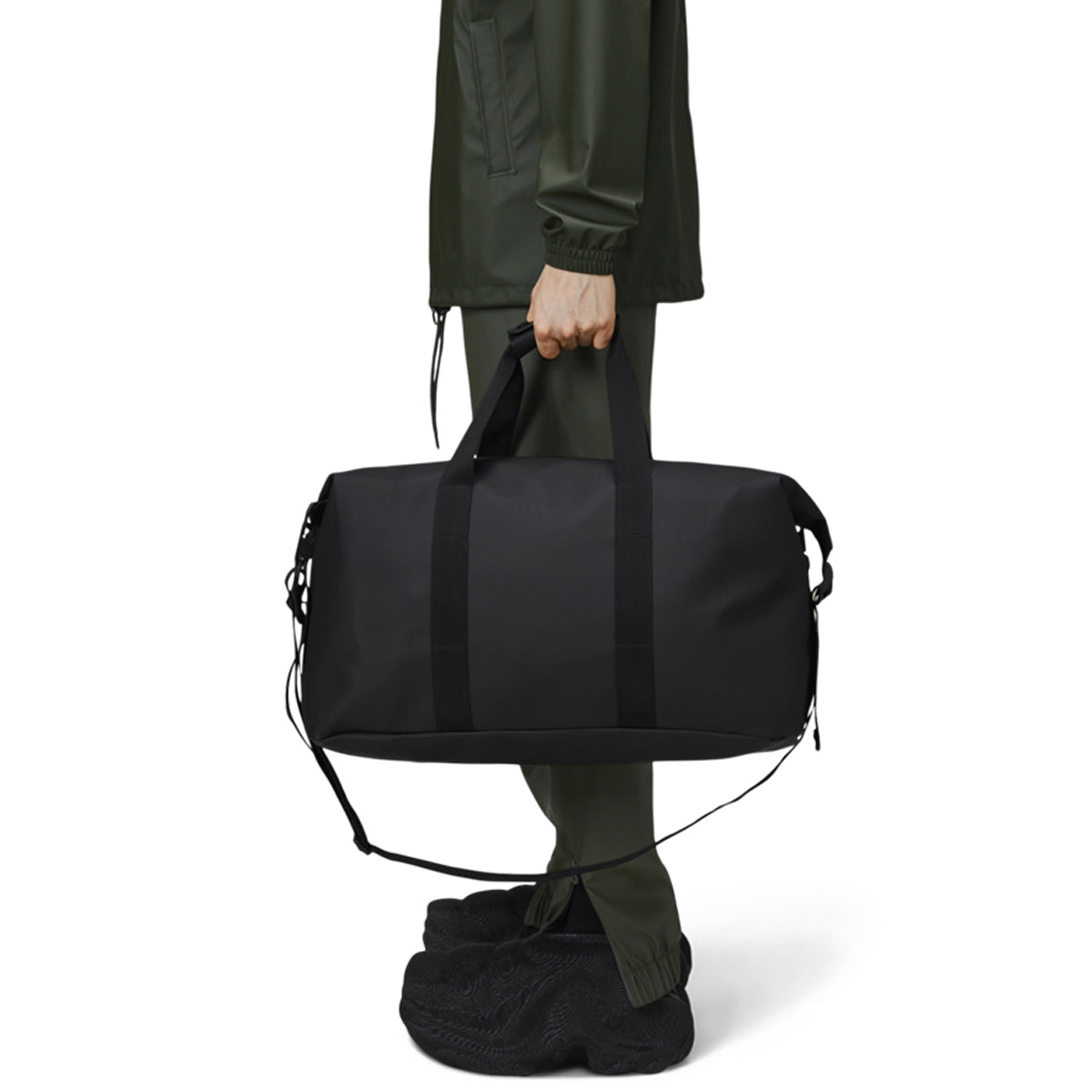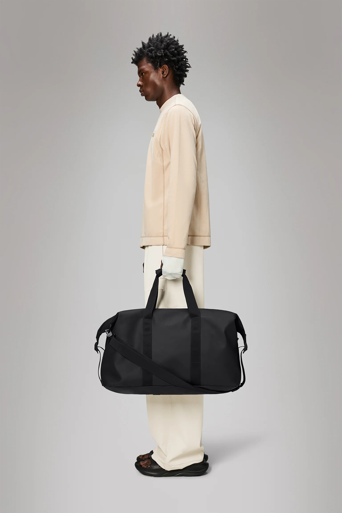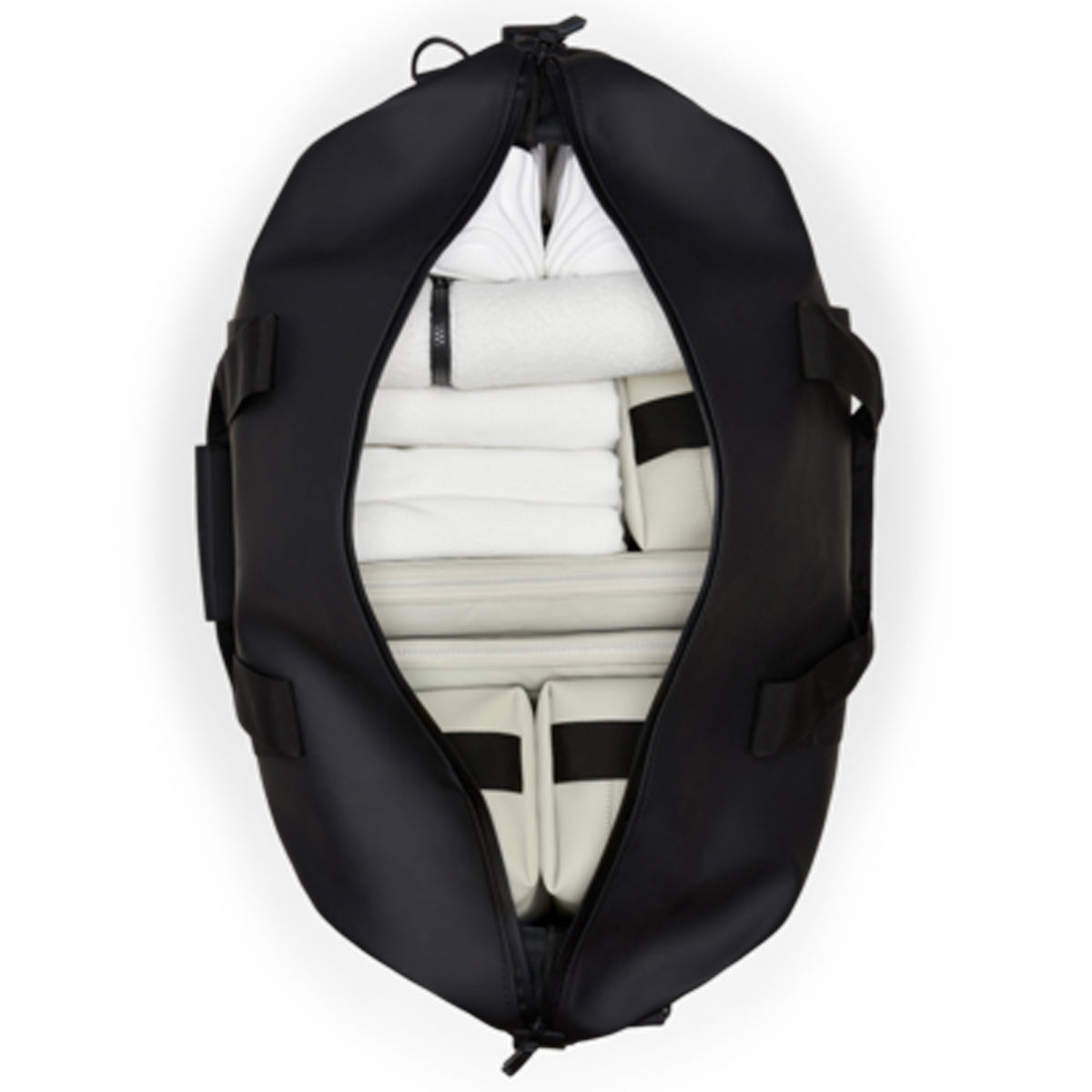 The Hilo Weekend Bag is Rains’ take on the essential travel bag, one of three sizes available. The travel favorite is clean and contemporary, and balances Rains’ waterproof fabric with signature strap and metal detailing. Unzip the full-length coated zipper to find a single, spacious compartment with room for clothing, tech, and more. Once packed, secure your belongings using the silhouette’s side compression straps. The design is finished with woven carry handles, with comfortable sleeve and attachment rings for an included detachable shoulder strap. The Hilo Weekend Bag is constructed from Rains’ signature waterproof PU fabric, designed for strength, durability, and a soft feel.