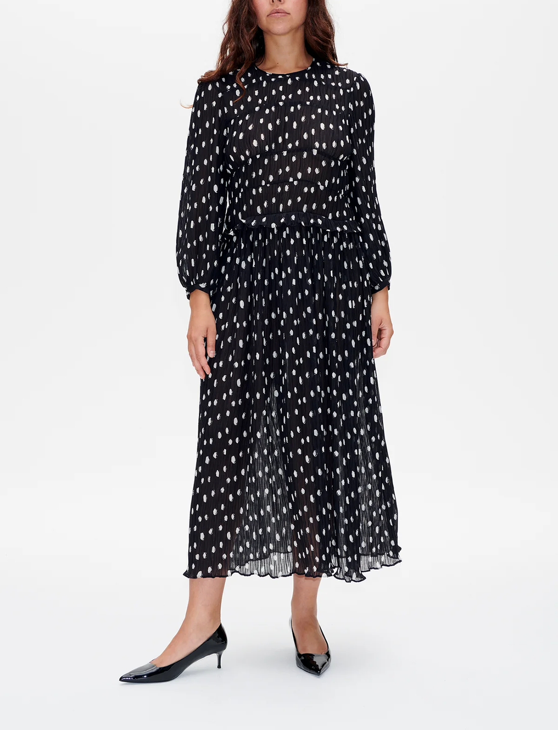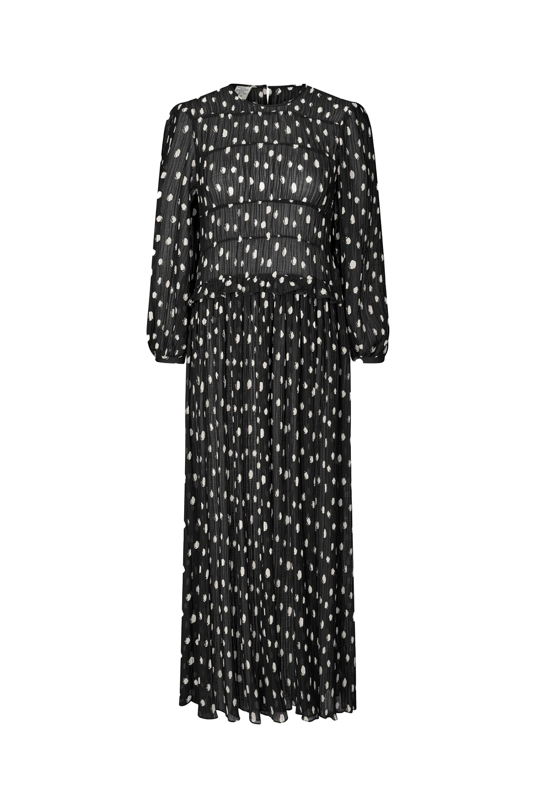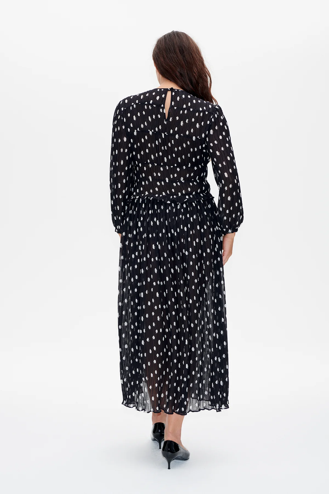 Este vestido plisado cuenta con un cierre de botones y una abertura en forma de ojo de cerradura en la espalda.