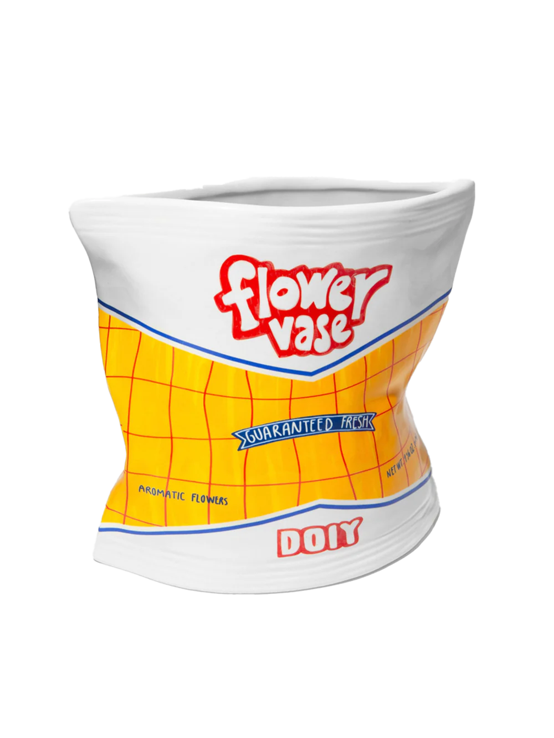 Este jarrón de cerámica con forma de bolsa de patatas fritas rinde homenaje a los vibrantes envases de alimentos de los años 60 y 70. Su diseño nostálgico evoca recuerdos de las tiendas de barrio y las delicias de antaño, añadiendo un toque retro y único a tu espacio con un estilo irrepetible.