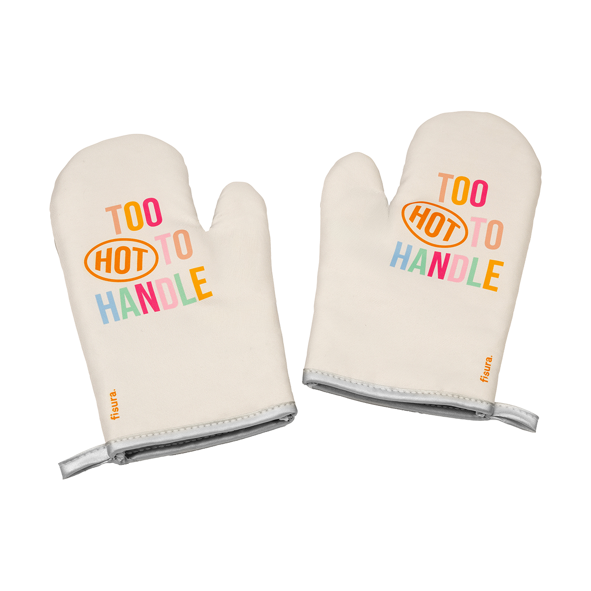Estas manoplas de horno con el mensaje "Too hot to handle" son perfectas para cocinar con estilo. Vienen en un set de 2, resistentes al calor, ideales para el horno o la barbacoa. Además, tienen un lazo para colgarlas fácilmente. ¡Cocina con actitud y protege tus manos con estas originales manoplas!