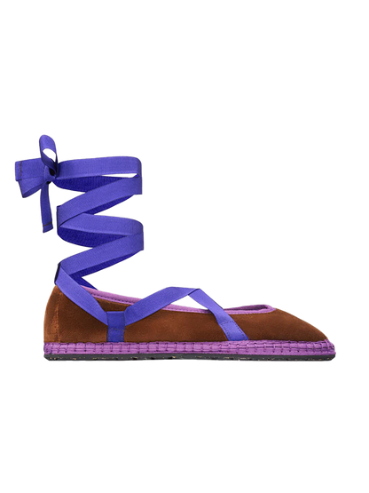 Bailarina en terciopelo de algodon marrón con ribetes en lila oscuro y lazadas cruzadas para atar al tobillo con cintas de color morado. El exterior del zapato es 100% terciopelo de algodón, y el interior del zapato es 100% algodón ecológico con tratamiento antibacteriano. La suela es de goma producida con neumáticos de bicicleta reciclados.