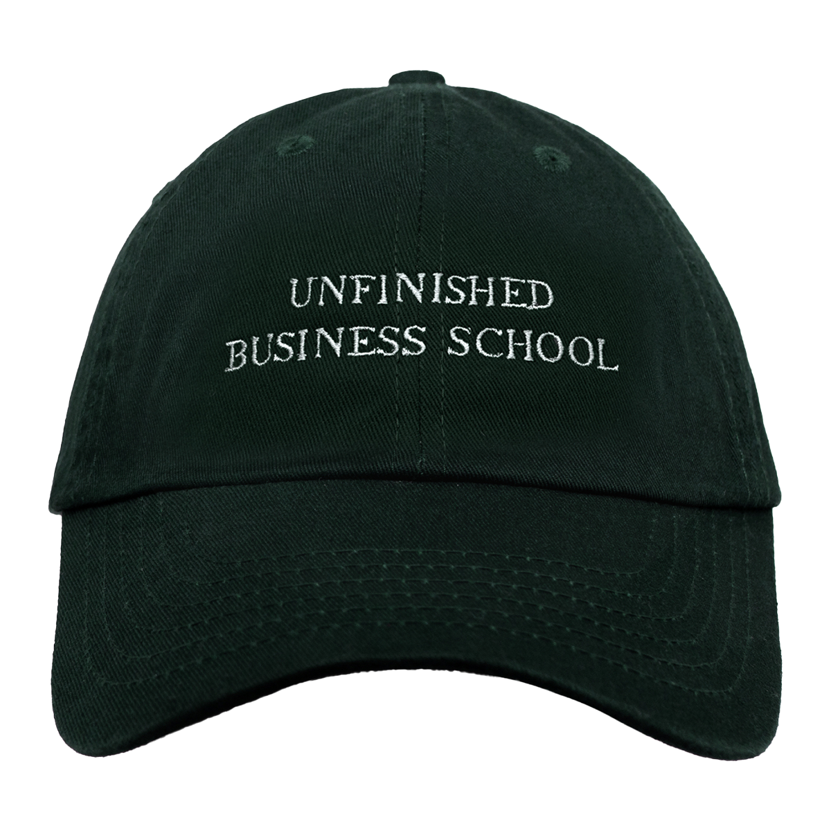Gorra de béisbol UNFINISHED BUSINESS SCHOOL de algodón, en verde bosque con bordado en blanco.