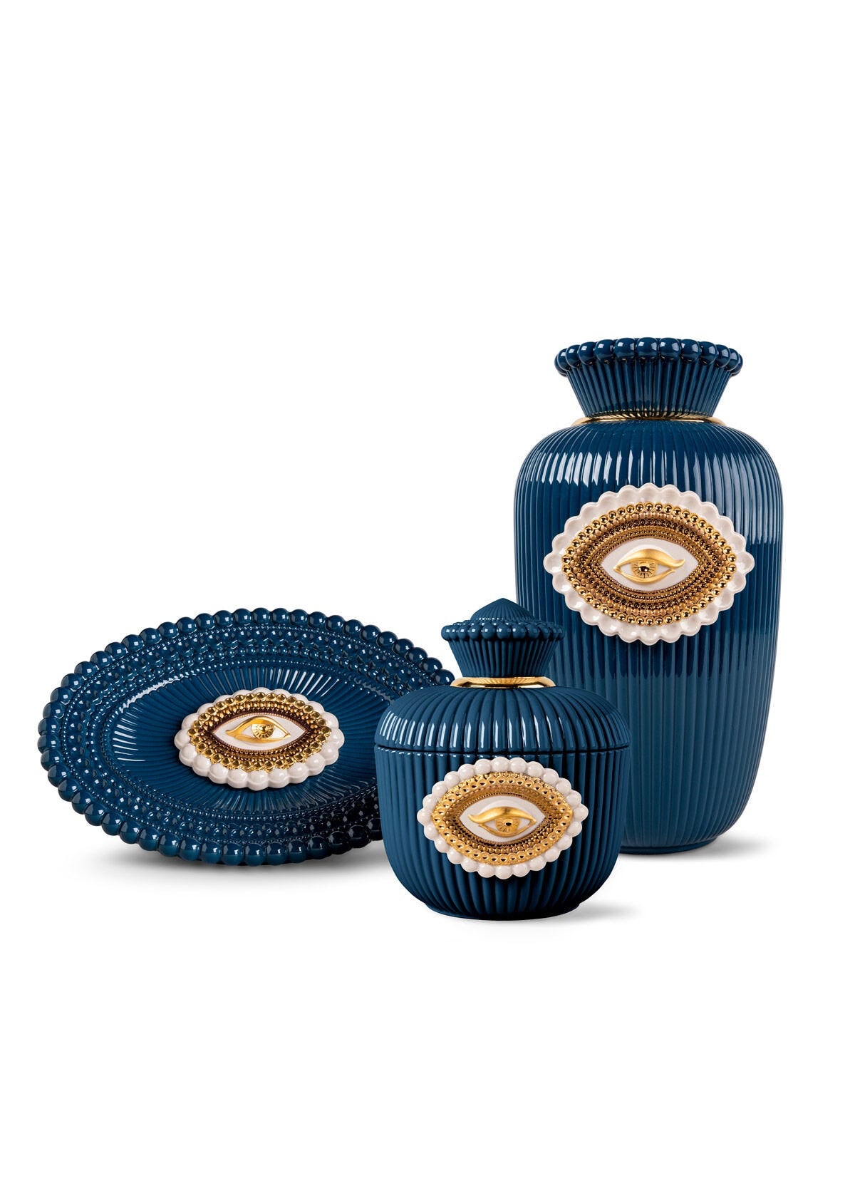En 1785, cuando Maria Anne Fitzherbert abrió una carta de amor de su admirador, el príncipe Jorge de Gales, no esperaba encontrarse con un ojo mirándola fijamente. Se habían enamorado, pero su noviazgo había sido desastroso. Las leyes reales prohibían que una viuda católica se convirtiera en monarca. Sin embargo, el príncipe estaba decidido a casarse con ella y le hizo llegar una carta con un regalo raro y fascinante, una miniatura en la que estaba pintado, únicamente, el ojo derecho del propio Jorge. Así, las miniaturas de ojos, también conocidas como ojos de amante, aparecieron por toda Gran Bretaña durante cerca de medio siglo. Como en el caso de la pareja real, la mayoría se encargaron como regalos que expresaban la devoción entre seres queridos. Todos eran íntimos y sumamente preciosos, siempre destinados a ser guardados en los bolsillos o prendidos cerca del corazón. Esta fascinante tradición es la que ha inspirado la colección Lover’s Eyes, y la ha traído al siglo XXI en objetos funcionales que parece que nos miran atentamente. En este caso, una bandeja protagonizada por un ojo grabado detalladamente sobre la porcelana. Para su decoración se ha optado por una combinación entre un azul Sajonia intenso y el lustre dorado sobre la porcelana blanca. Una creación cargada de significado, funcional e hipnótica.