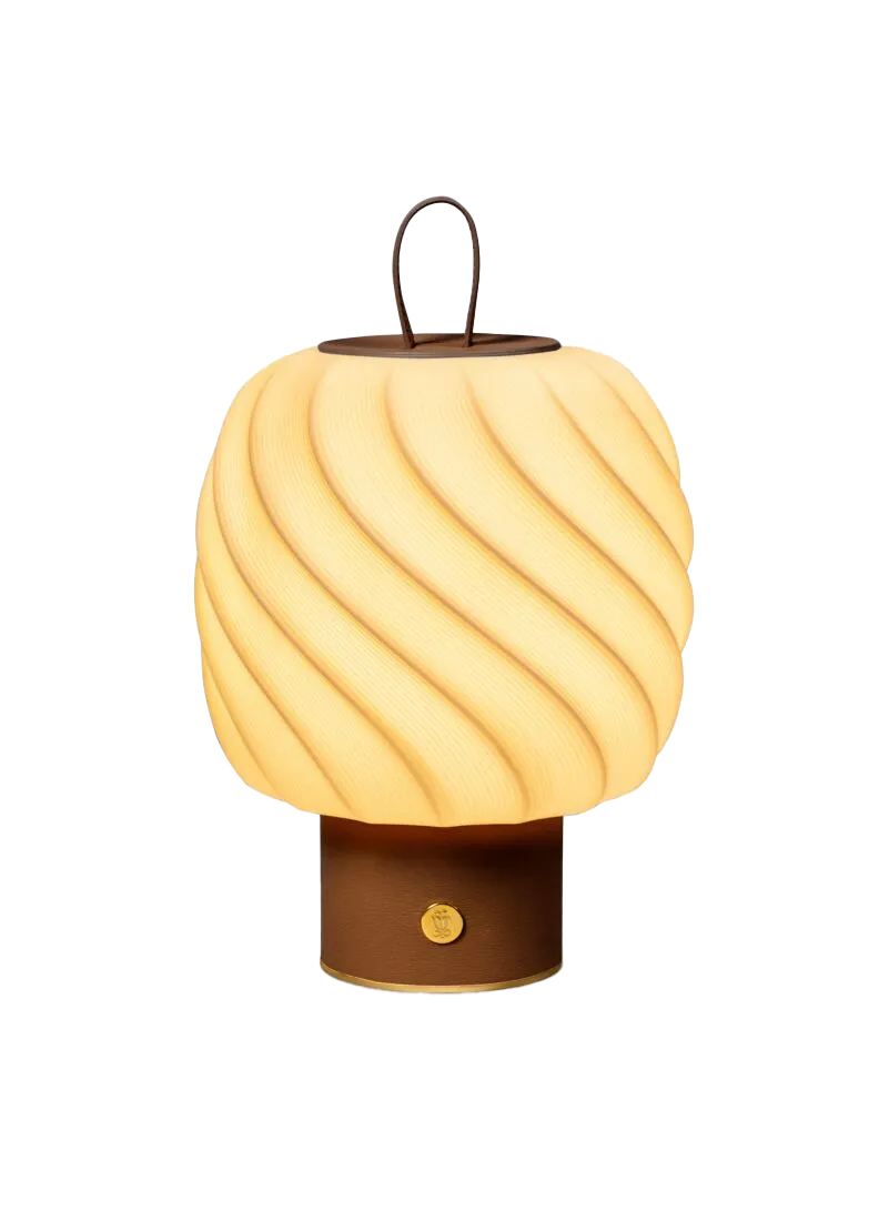 Esta lámpara inalámbrica está elaborada con porcelana blanca mate y cuenta en su interior con una bombilla LED. Gracias al carácter translucido de la porcelana, cuando se enciende la luz, se iluminan las delicadas y sinuosas líneas grabadas a mano en ésta. Cuenta con base forrada de cuero marrón y con una tapa superior y un asa, del mismo material y color, que permite que la lámpara se pueda colgar, como las tradicionales linternas de papel japonesas. En la parte frontal de la base, lleva un placa dorada, con la flor del logotipo de Lladró, que es el interruptor táctil de la lámpara y a su vez es el regulador de la intensidad de la luz.