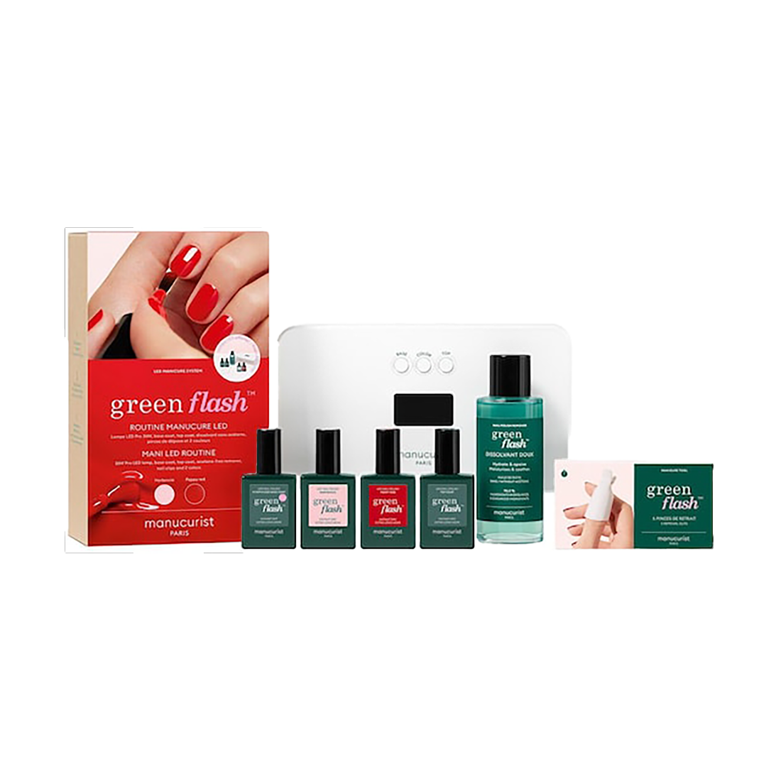 El Kit Pro Green Flash™ incluye todo lo necesario para una manicura impecable con secado instantáneo y hasta 12 días de duración. Contiene base coat, 2 colores, top coat, lámpara LED, removedor sin acetona y clips. Formulado con ingredientes bio-basados, es vegano y de fabricación francesa.