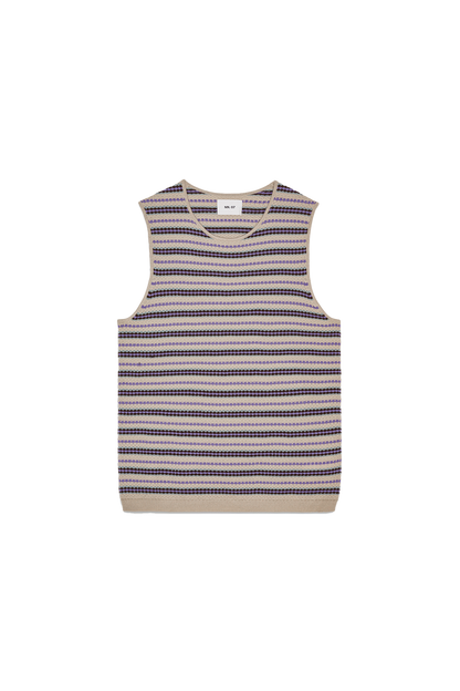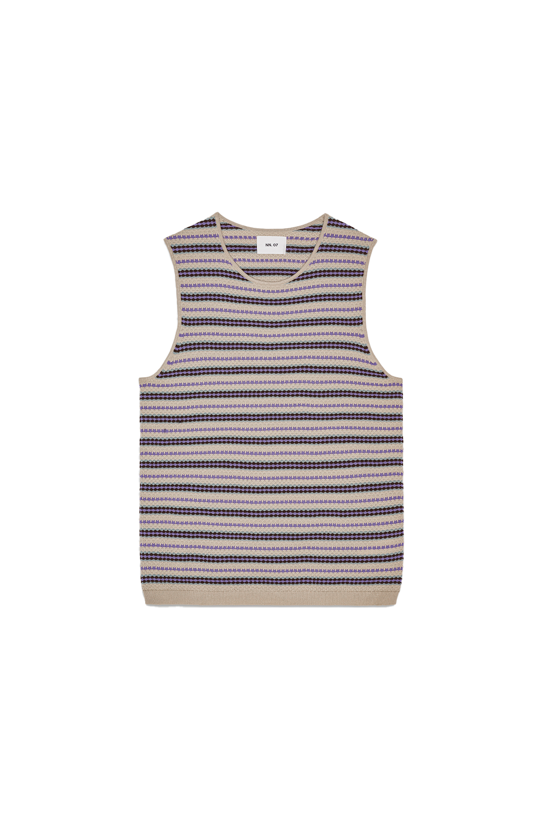 Top de punto confeccionado en algodón orgánico texturizado, diseñado con rayas multicolor