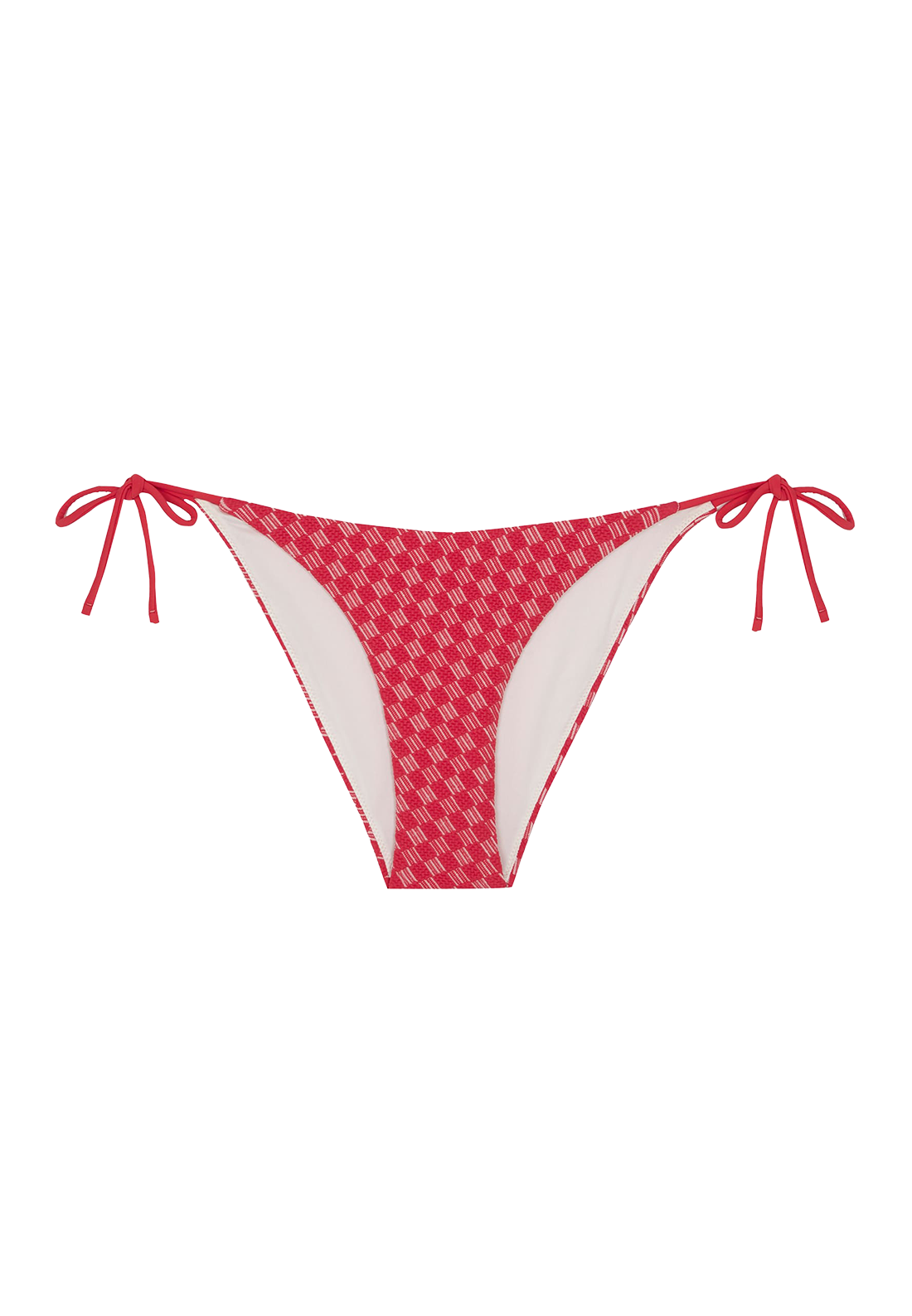 Braga de bikini con cobertura clásica y diseño geométrico en rojo y blanco. Confeccionada en tejido estructurado, incorpora lazos ajustables a los lados y forro delantero y trasero para mayor comodidad. Perfecta para combinar y lucir estilo esta temporada.