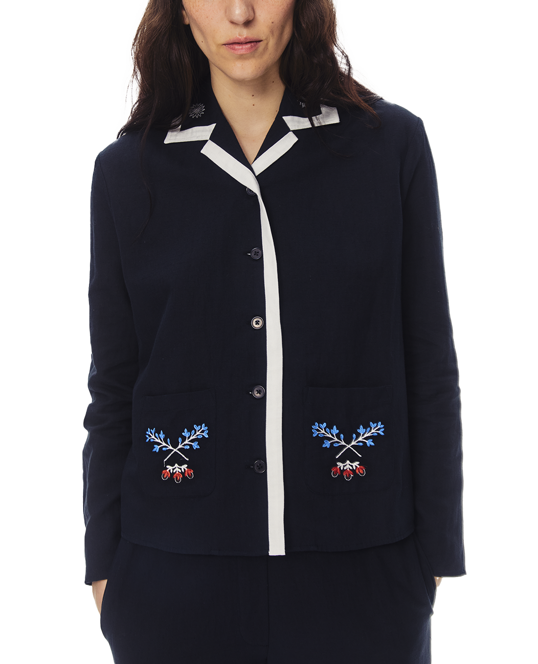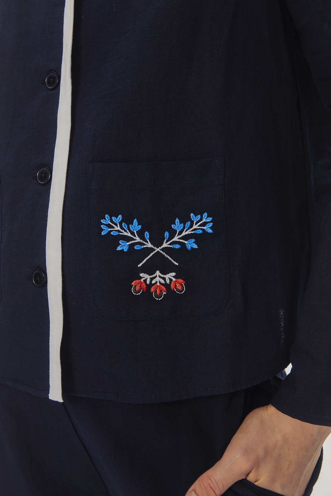 Camisa bordada de corte relajado, confeccionada en una mezcla de algodón y lino para un acabado ligero y transpirable. Su diseño sofisticado destaca por detalles bordados que aportan un toque artesanal y elegante. Con cuello clásico y cierre de botones, es una prenda versátil ideal para combinar con pantalones o faldas y crear looks refinados y modernos.